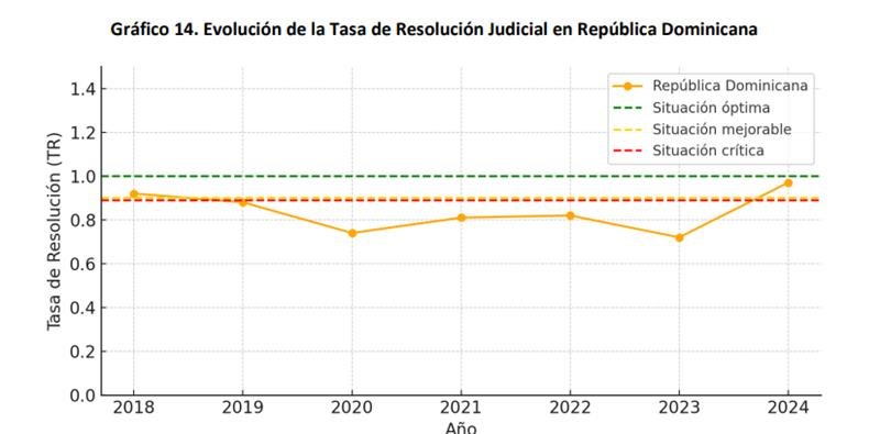 El estudio indica que República Dominicana, redujo en un 30 % su tasa de congestión judicial entre 2023 y 2024, así como alcanzó una tasa de resolución de 0.97, superando los niveles previos a la pandemia y situándose en el tercer lugar regional, solo detrás de Costa Rica (1.07) y Perú (1.06, cuya tendencia fue a la baja).