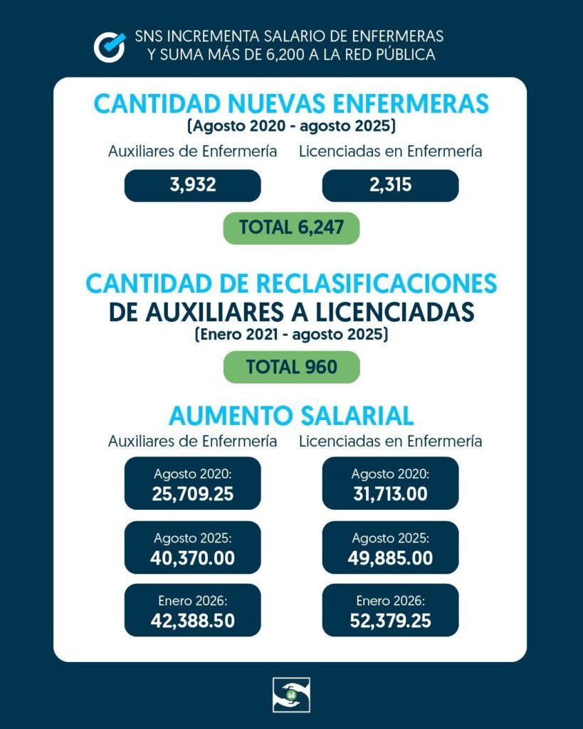 En el caso de las licenciadas en enfermería, el salario pasó de RD$31,713.00 en 2020 a RD$49,885.00 en agosto de 2025, con una proyección de RD$52,379.25 en enero de 2026, en cumplimiento a los acuerdos establecidos.