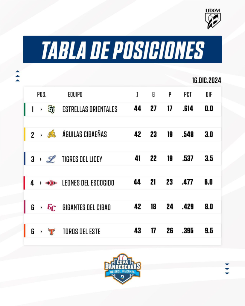 Santo Domingo.- La Liga de Beisbol Profesional de República Dominicana (LIDOM) ha publicado la tabla de posiciones más actualizada, en base a los resultados de los últimos partidos de la pelota invernal.