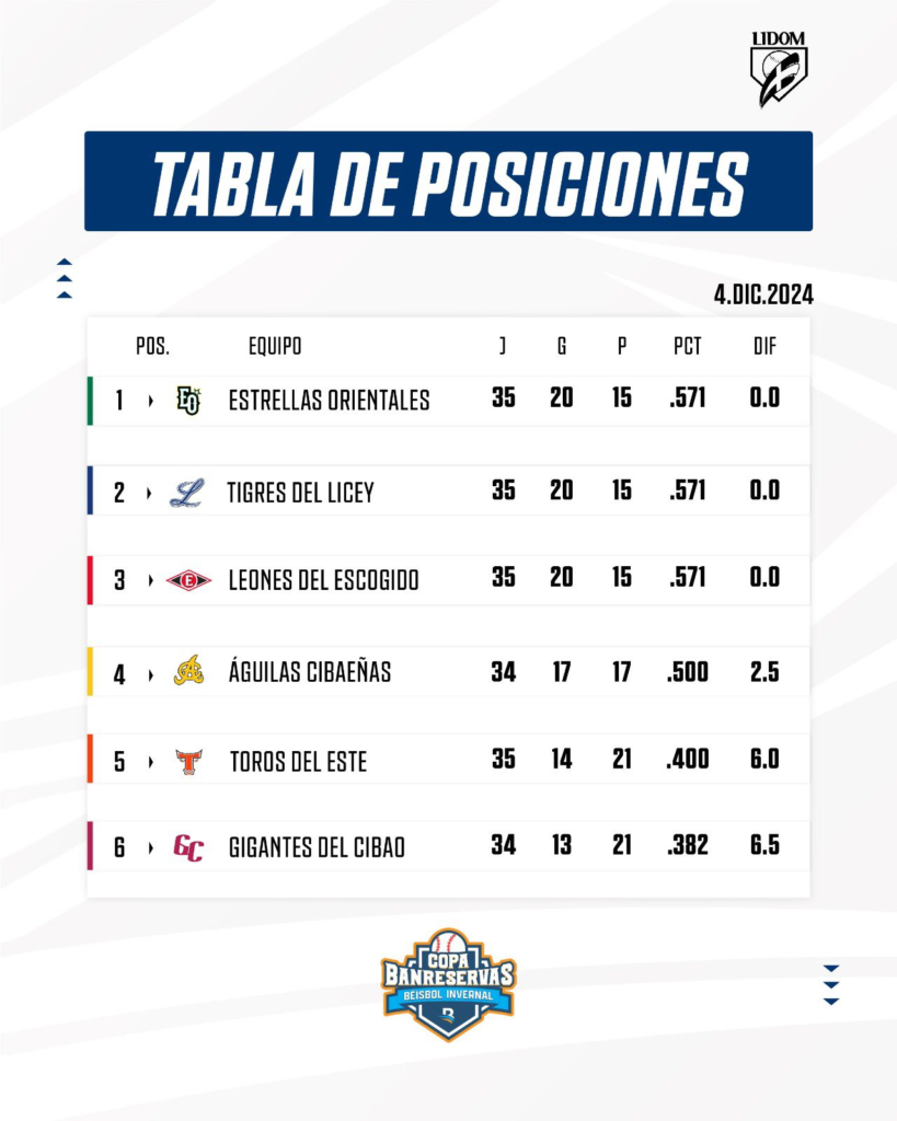 Santo Domingo.- La Liga de Beisbol Profesional de República Dominicana (LIDOM) ha publicado la tabla de posiciones más actualizada, en base a los resultados de los últimos partidos de la pelota invernal.