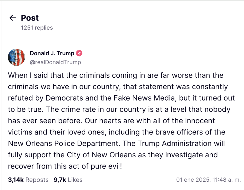 El mandatario electo señaló que la criminalidad en el país ha alcanzado niveles alarmantes: "La tasa de criminalidad nunca ha sido tan alta. Nuestros pensamientos están con las víctimas inocentes, sus familias, y los valientes agentes del Departamento de Policía de Nueva Orleans".
